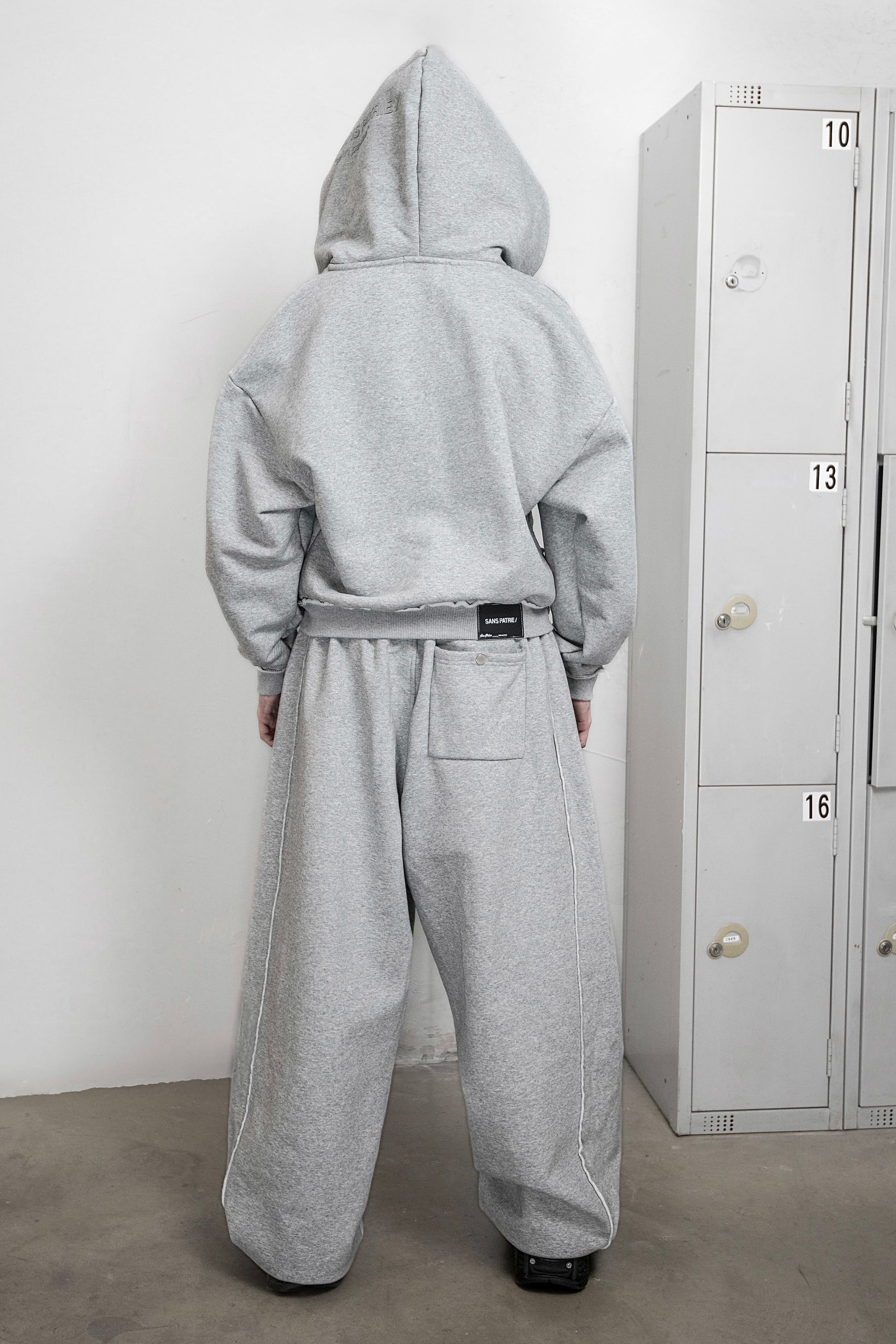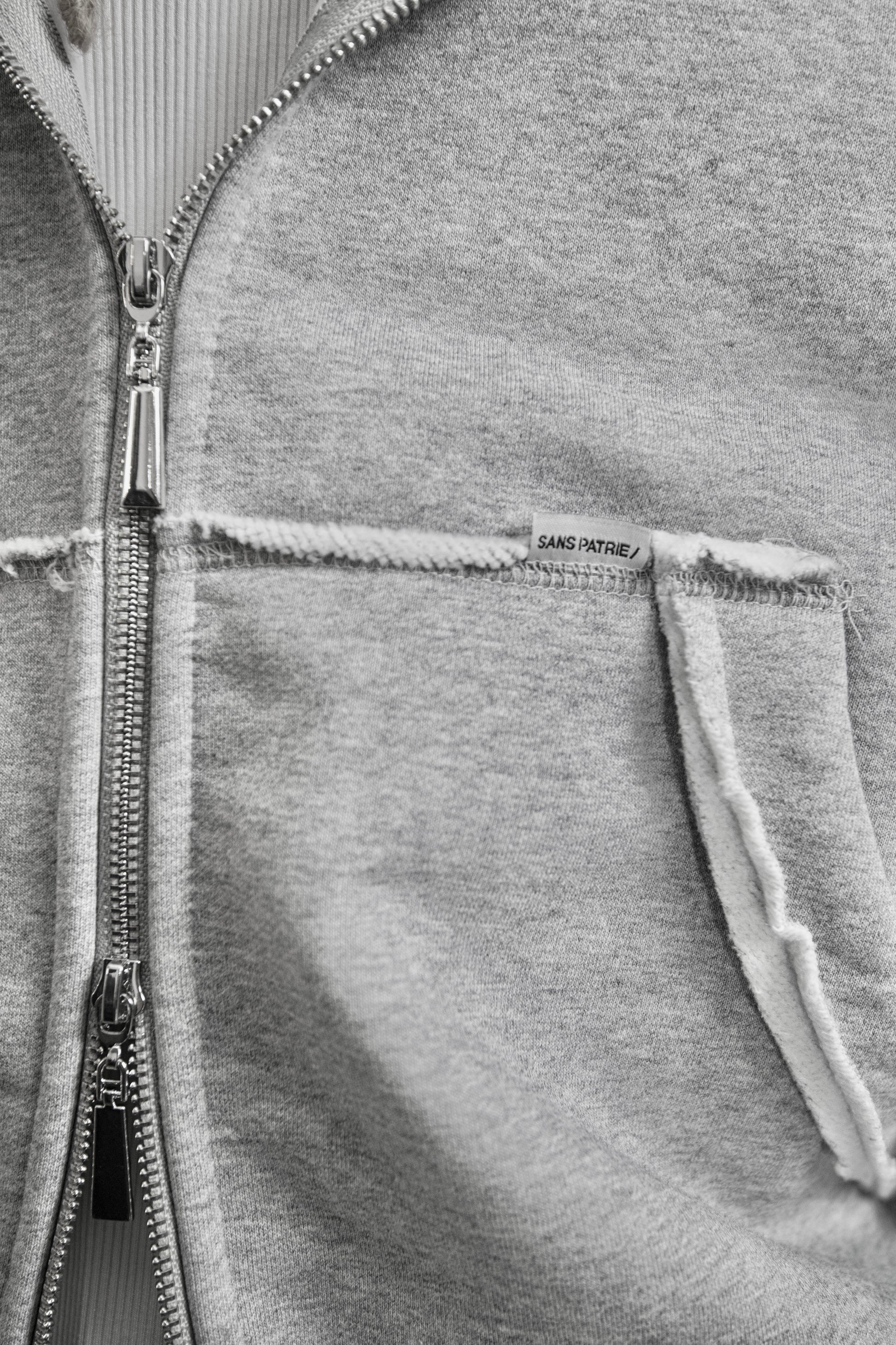Constructed from extra-thick fabric, this cropped piece features a washed grey finish, distressed details, and a double zipper.