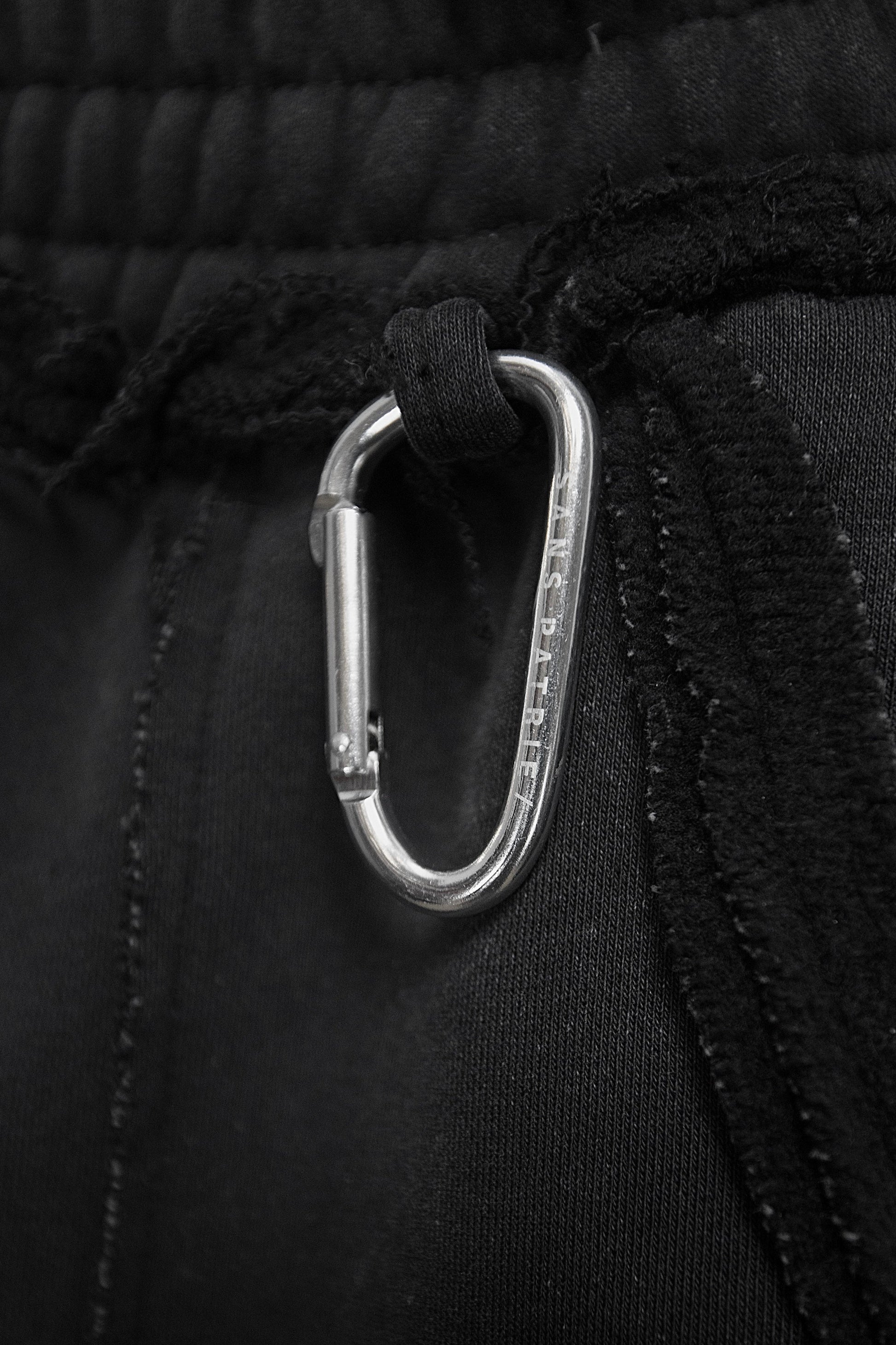 very comfortable black washed heavy weight sweatpants featuring distressed details, printed script along the sides, and a built in key holder with branded carabiner.